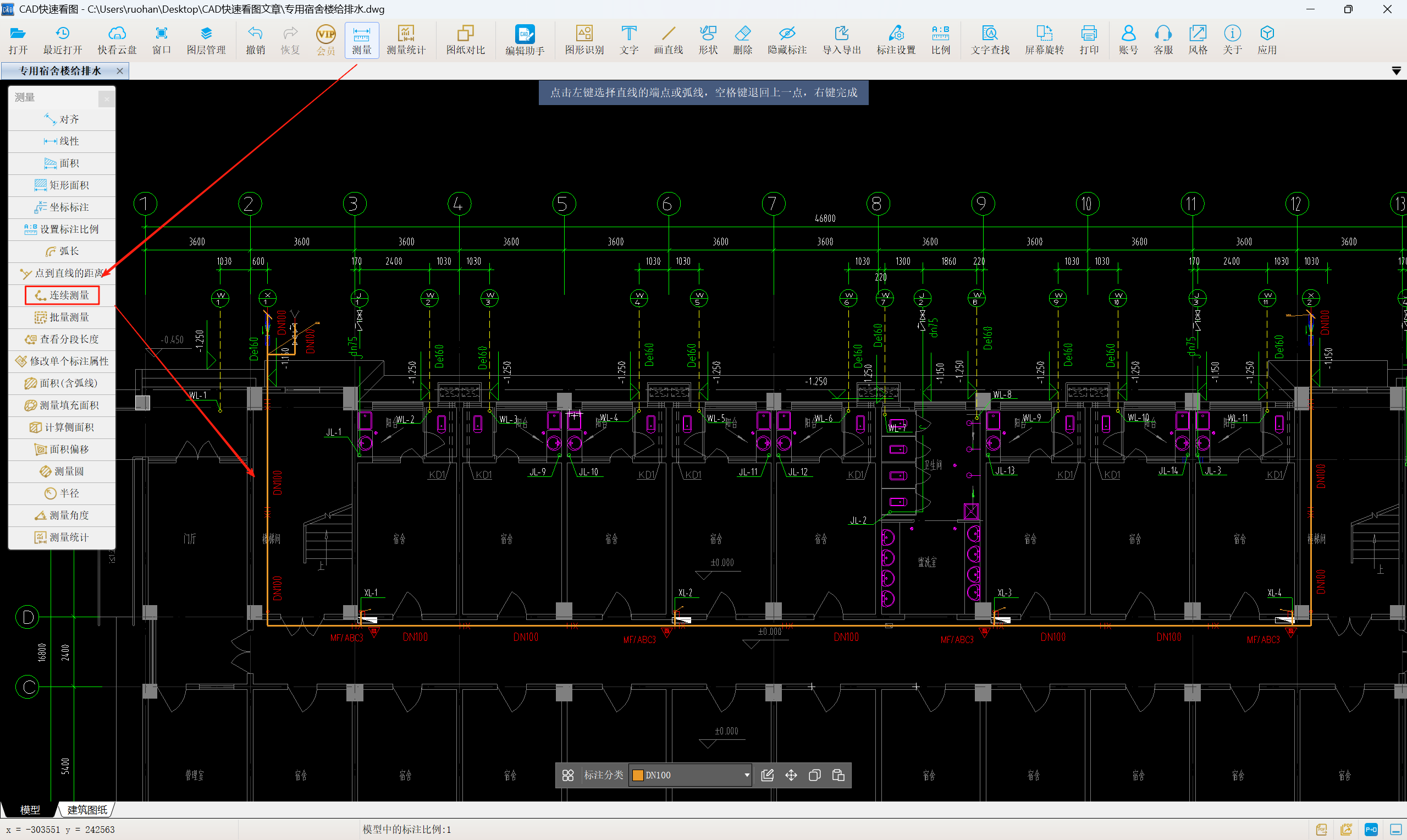 第三步在平面图中使用【连续测量】功能,测出所有DN100水平长度。