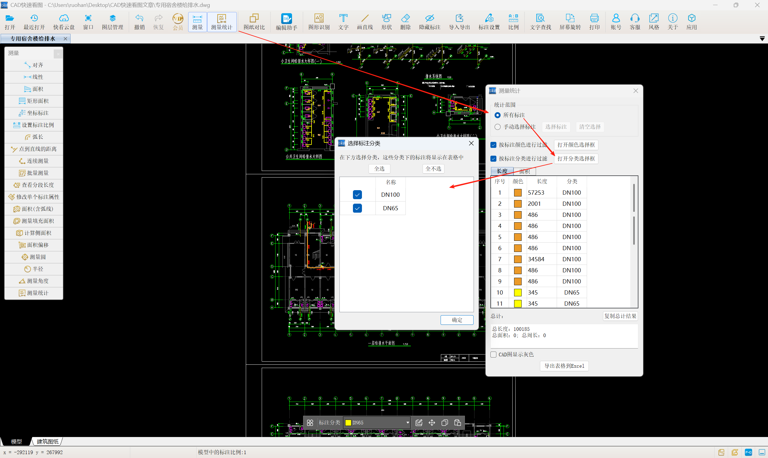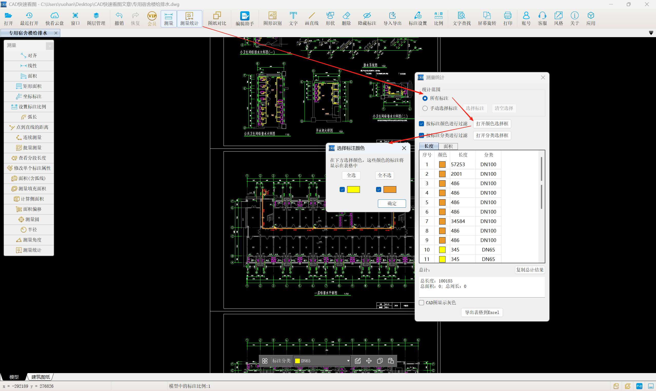 第五步,使用【测量统计】功能,选择所有标注,勾选按颜色过滤和分类过滤两种模式,打开颜色选择框或者分类选择框,都可以进行工程量统计,分别得到DN100水平长度97.24m,DN65水平长度2.945m。